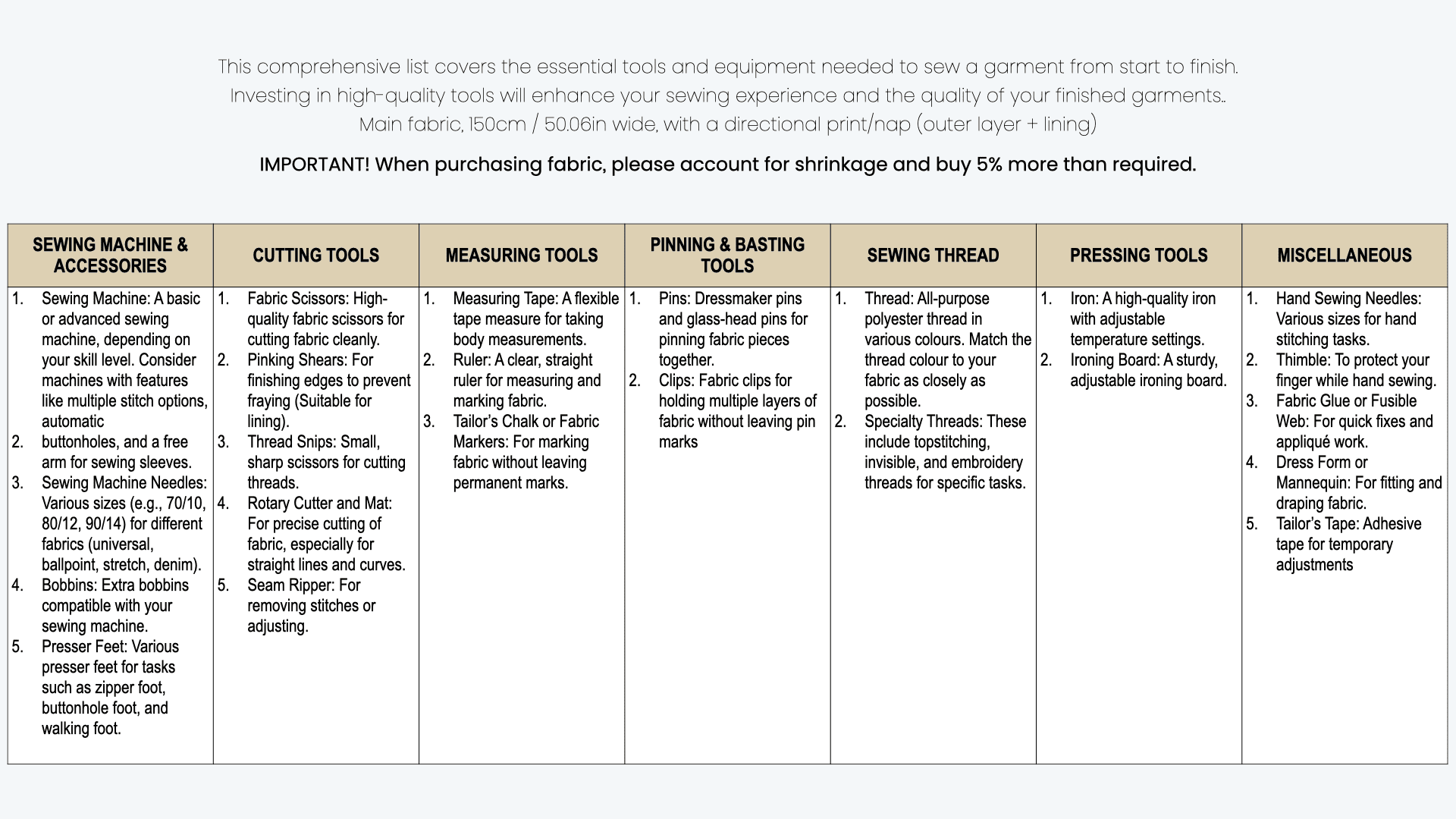 Size charts, Notion List and Printing Instructions